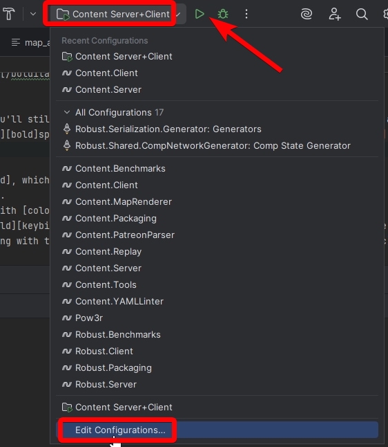 The SS14 client and server are independent projects, but both can launch with a single button somewhere in your IDE. This needs to be set up, however. Note: It is recommended that you run Content.Client and Content.Server when developing from your IDE. Not Robust.Client or Robust.Server. The reason is that running Content.* will make your IDE aware of dependencies correctly and ensure everything is rebuilt nicely. If you run Robust.Client directly you have to make sure the solution is fully built every time which is annoying and easy to forget. If you’re unsure what Robust or Content are, check out this page on how the project is organized.