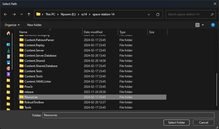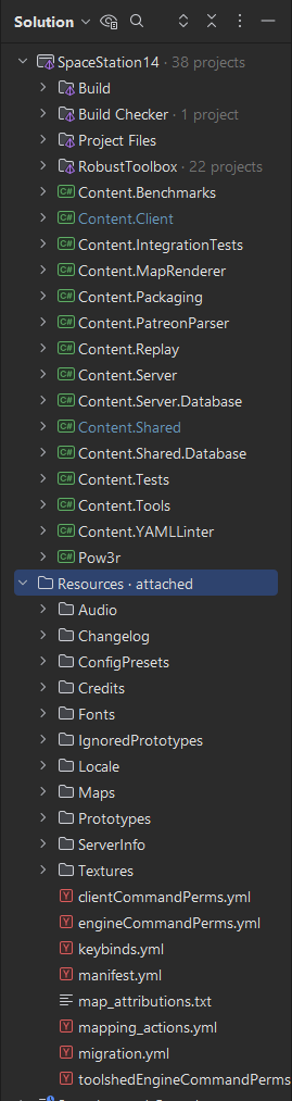 C# IDEs like Visual Studio and Rider do not automatically show the Resources folder in the project. This folder contains all non-C# files such as sprites, audio, and most importantly, YAML prototypes. These instructions will explain how to get this folder to show up in your IDE, so you can easily work with it.